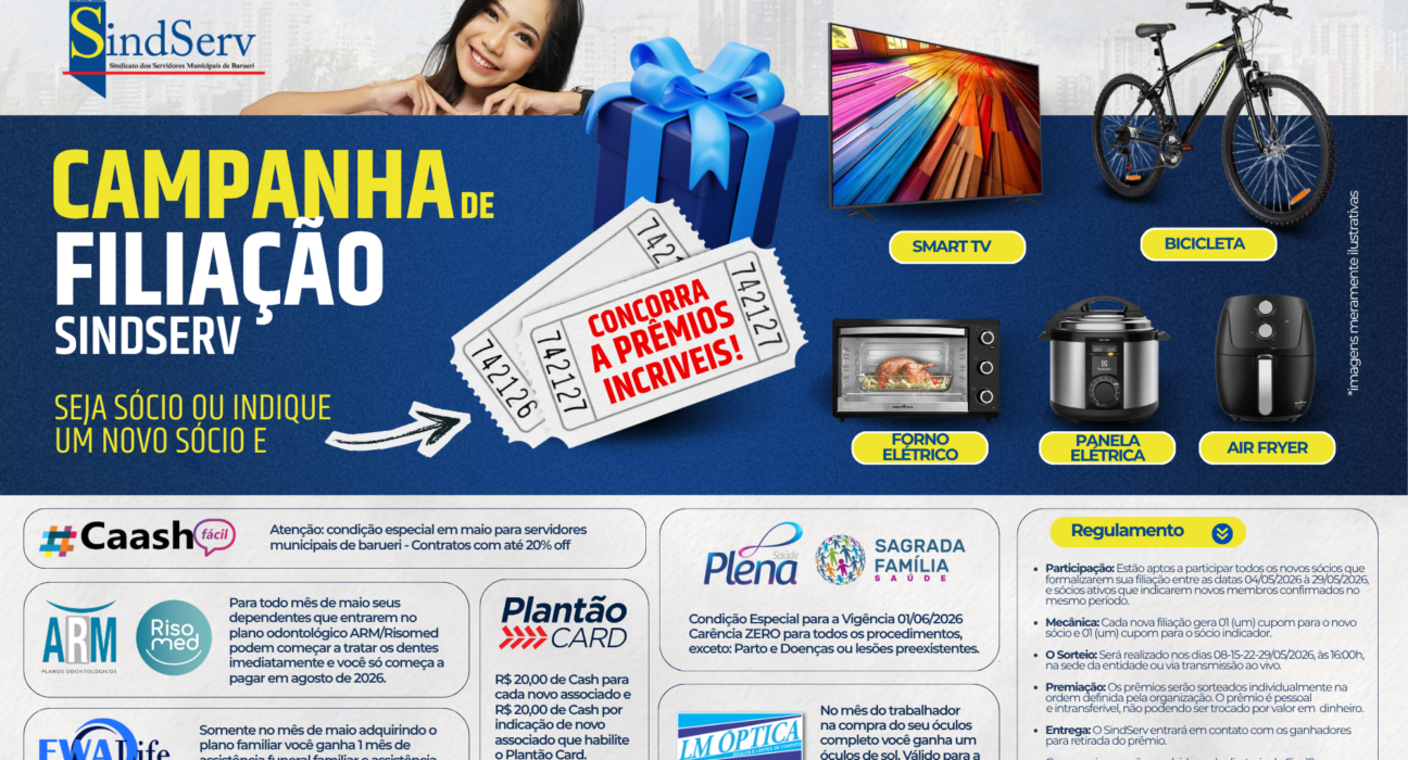 No mês do trabalhador o SindServ abre as portas para sua campanha de filiação, com prêmios, serviços e descontos exclusivos de parceiros para quem se filiar no mês de maio, confira o regulamento! e intransferível, não podendo ser trocado por valor em dinheiro.