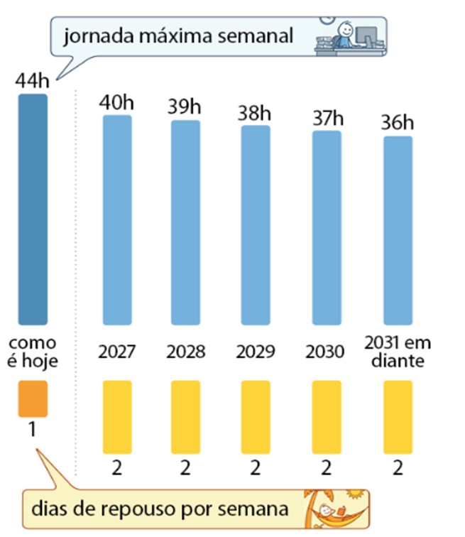 De acordo com a PEC 148/2015, o fim da chamada escala 6×1 ocorrerá de forma gradual. No ano de publicação do texto, as regras atuais se manterão. Já no ano seguinte, o número de descansos semanais passará de um dia, como é hoje, para dois dias na semana e a jornada começará a ser reduzida. Apenas seis anos depois os novos direitos estarão plenamente instituídos.