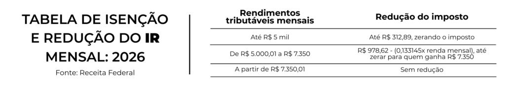 Já está em vigor a nova faixa de isenção do Imposto de Renda para quem ganha até R$ 5.000,00, além de uma redução gradual e significativa nos descontos para os trabalhadores que recebem até R$ 7.350,00.